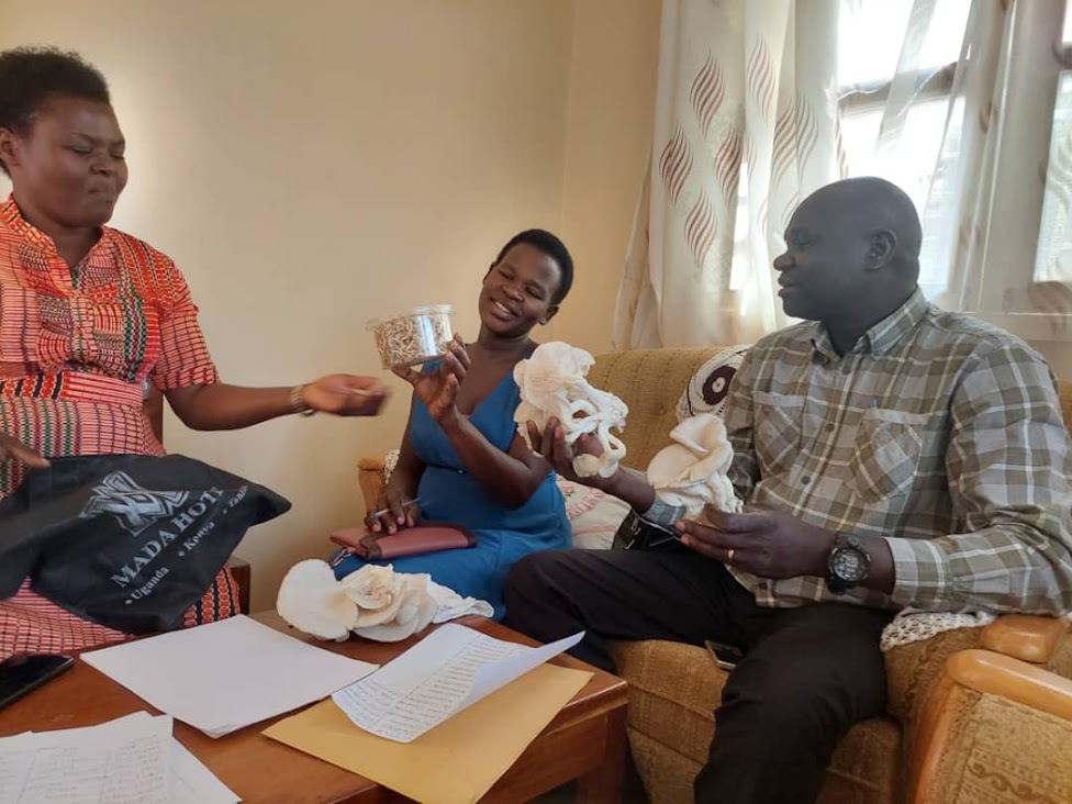 Annet explains to her neighbours how her mushroom projects has improved on her income